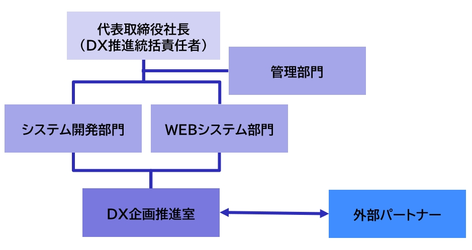 当社代表取締役をDX推進統括責任者とし、専門部署「DX企画推進室」を設置、専任スタッフを配置してDXプロジェクトを推進します。